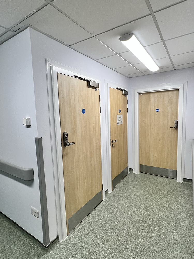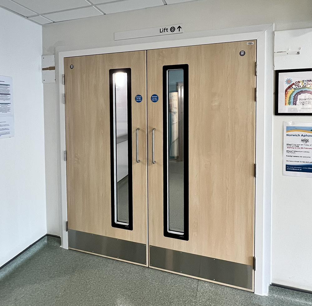 Including our double cross-corridor fire doors, which are wrapped in a hygienic, hard wearing, attractive surface and feature flush vision panels, which reduces damage and simplifies the demands on cleaning staff to maintain cleanliness… and they look amazing too!